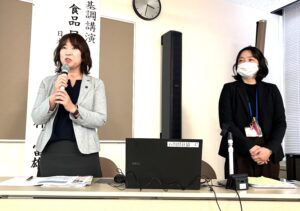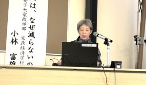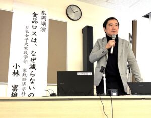 3つのカリキュラムで行われ、①当会の活動紹介を当会の青海(あおみ)理事が説明、②基調講演が日本女子大学家政学部家政経済学科の小林富雄教授による「食品ロスはなぜ減らないのか」のテーマで講演がされました。その内容は食品ロスの原因や賞味期限の設定の不備、諸外国と日本の状況の差など詳しく説明をされました。③活動報告として「金沢版子ども宅食推進事業の取り組み」を金沢市子育て支援課の前田和歌子さん、金沢市社会福祉協議会の西馬彩希(さいば あやき)さんの両名から金沢市8つのブロックで実施している子ども宅食の取り組み内容について説明を受けました。