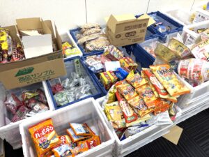 そして、商談会終了後の2月6日には、各参加メーカー様からカナカン㈱様を通じて、当会に大量の食品を頂きました。この商談会は年2回開催しており、その度に当会に食品を寄贈頂いていますが、商談会ということもあり、新商品的な食品も多くあり、当会の在庫を賑やかして頂いています。