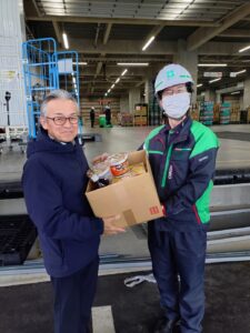 (写真:センコー㈱ご担当者の千綾様から食品を受け取る当会担当者)