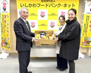 マルハン福久店様の半田光代様(写真右)、向江光代様(写真中央)から当会の渡邊副理事長に食品寄贈
