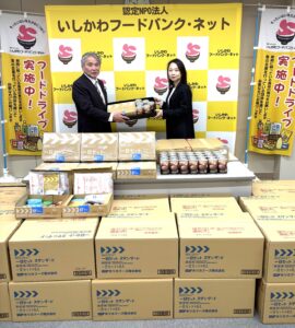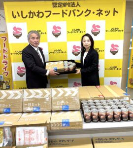 ㈱NTTドコモ北陸支社様からは「備蓄している非常食を、必要としている方々へお届したいという思いから、寄贈させて頂きました。災害への備えを大切にしながら、今後もフードロス削減とともに、食を通じた地域支援の取り組みを継続してまいります。」との思いも頂きました。