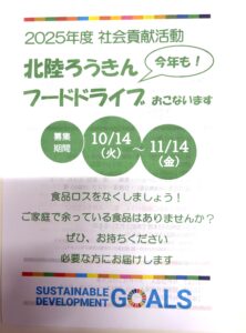 その北陸労働金庫様は2025年10月14日~11月14日の間、各店頭でお客様に、会員組合や職場内にて呼びかけをし、フードドライブ活動を展開頂きました。