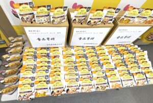 今回頂きました備蓄品は真柄建設様の在庫の4分の1が入れ替えになる分とのことでした。特徴的には賞味期限まで約2年ほどあり長期的なこと、またアルファ米だけで種類も9種類、加えてパスタ2種類と多様なことでした。真柄社長様いわく「能登半島地震の被災者支援の為に賞味期限が近い品は既に使っており、賞味期限まで長い品の贈呈となったが、その方が良いと思いお持ちした。種類が多いのは実際に食する人の立場を考え飽きさせない工夫をしたかった為、多く揃えている。」との理由をお聞かせ頂きました。